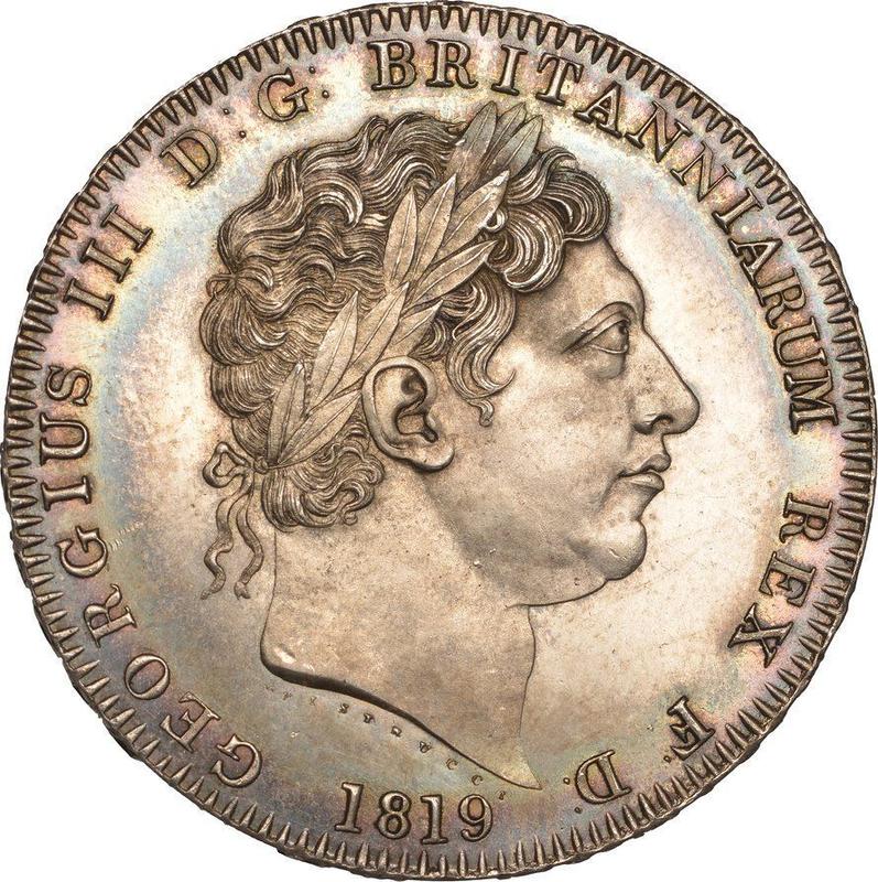 Find out the current coin value of the British Crown 1819 . Edge "LIX". This silver coin from the times of George III. Wondering how much a coin like this is worth? The record price belongs to the lot 32743 sold at the Heritage Auctions auction for USD 10,500. Bidding took place January 21, 2021.