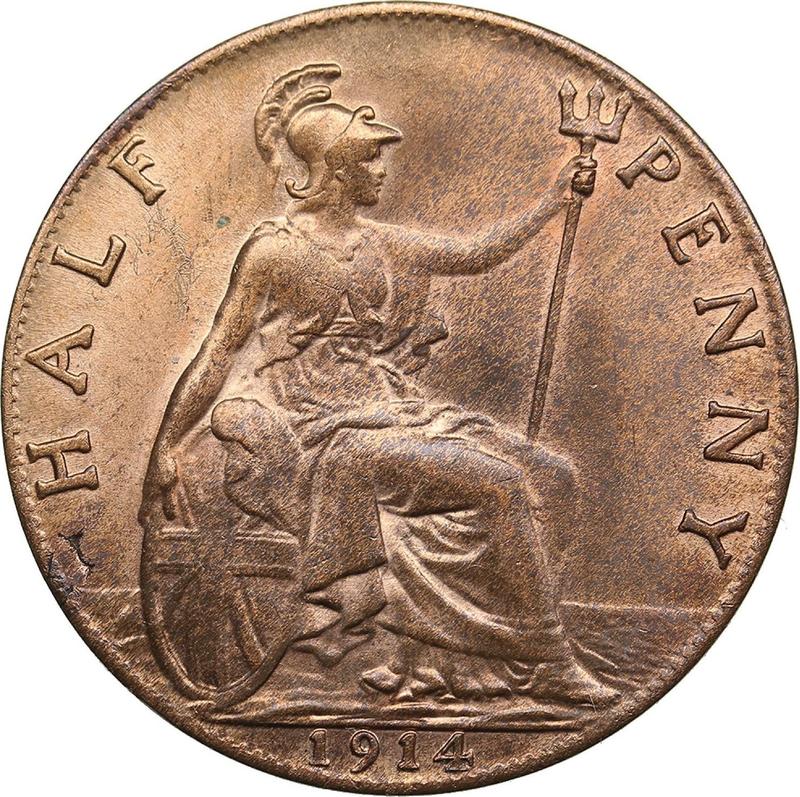 The information on the current value of the British coin Halfpenny 1914 is based on actual auction sales of similar specimens. To reflect the current price level, our service monitors over 590 numismatic companies and records auction results in the coin catalog and auction archive. Please note that the exact value depends directly on the coin's condition, so the average price serves only as an approximate estimate.