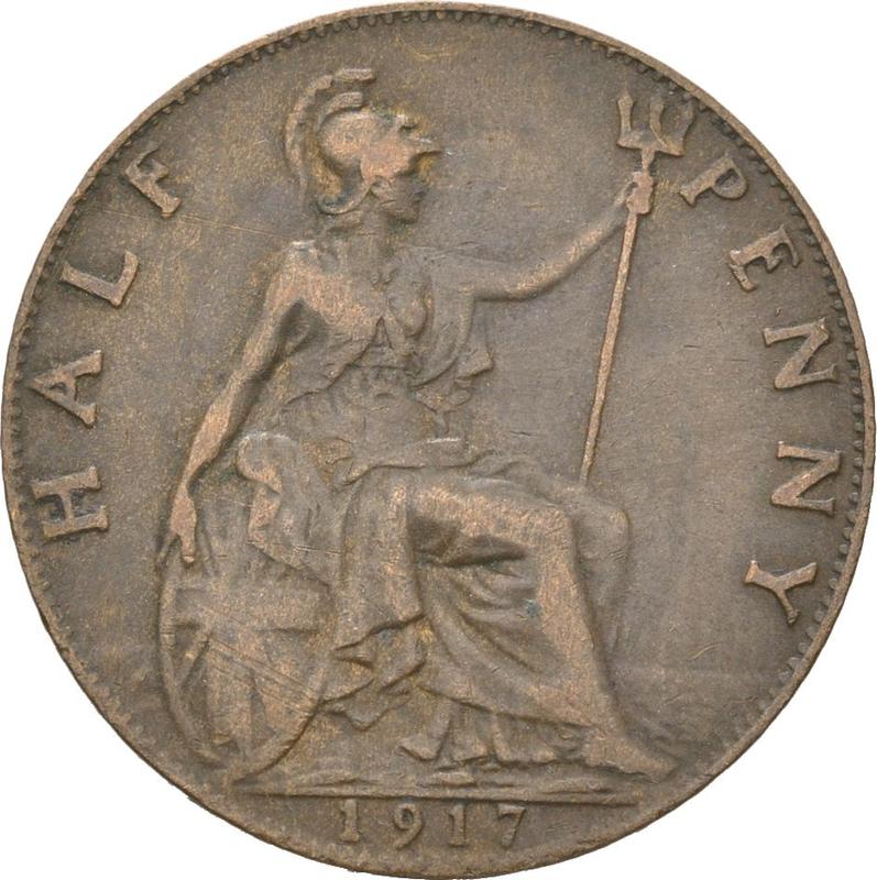 Find out the current coin value of the British Halfpenny 1917 . This bronze coin from the times of George V. Wondering how much a coin like this is worth? The record price belongs to the lot 39243 sold at the Heritage Auctions auction for USD 204. Bidding took place July 29, 2018.