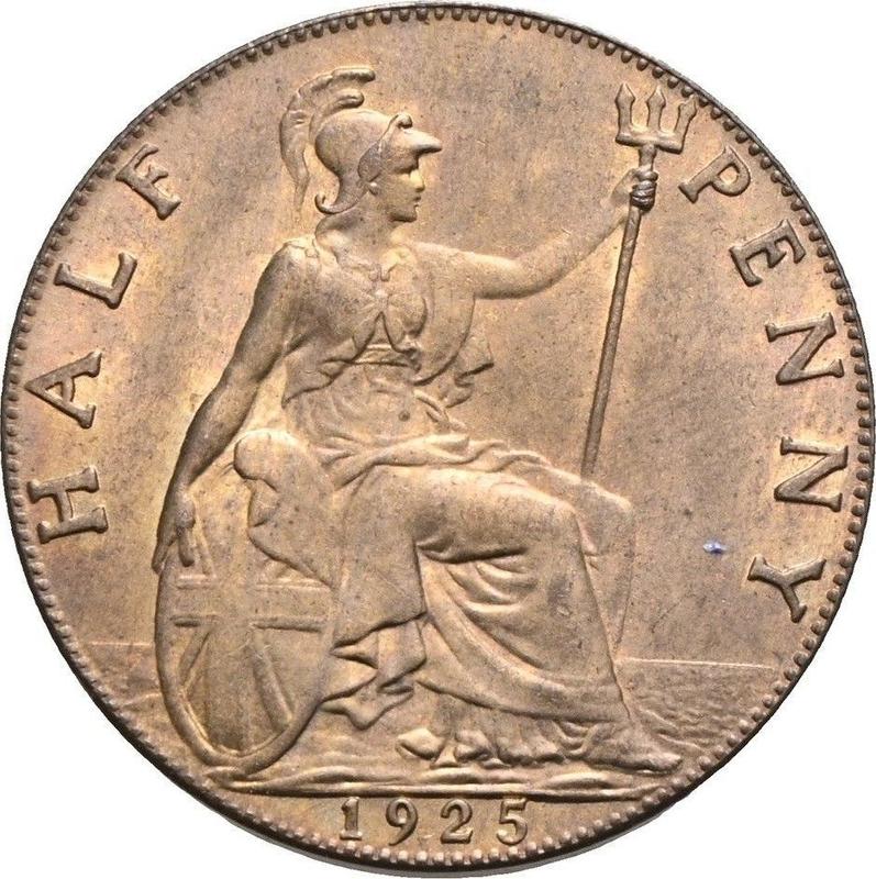 Find out the current coin value of the British Halfpenny 1925 . This bronze coin from the times of George V. Wondering how much a coin like this is worth? The record price belongs to the lot 1623 sold at the Spink auction for GBP 300. Bidding took place September 28, 2005.