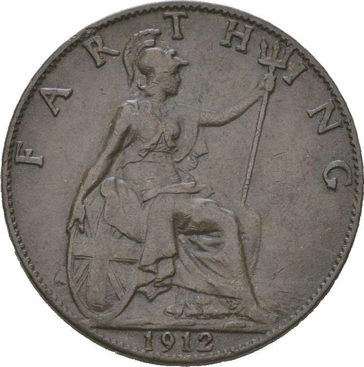 Find out the current coin value of the British Farthing 1912 . This bronze coin from the times of George V. Wondering how much a coin like this is worth? The record price belongs to the lot 176 sold at the The Coin Cabinet auction for GBP 15. Bidding took place October 23, 2025.