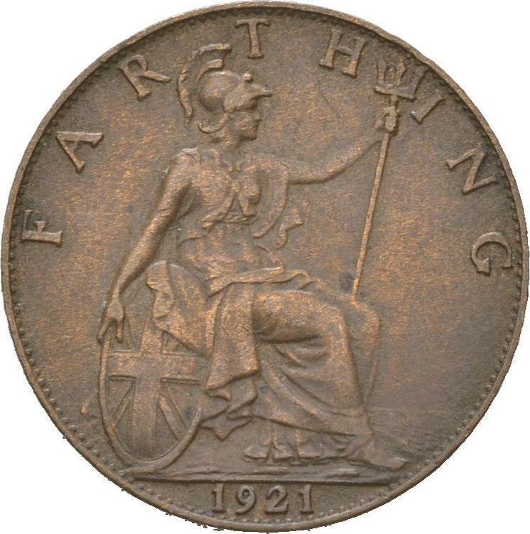 Find out the current coin value of the British Farthing 1921 . This bronze coin from the times of George V. Wondering how much a coin like this is worth? The record price belongs to the lot 3992 sold at the TimeLine Auctions auction for GBP 19. Bidding took place June 2, 2020.