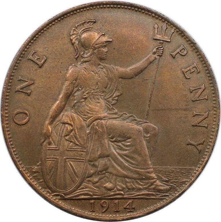 Find out the current coin value of the British Penny 1914 . This bronze coin from the times of George V. Wondering how much a coin like this is worth? The record price belongs to the lot 65324 sold at the Heritage Auctions auction for USD 600. Bidding took place August 30, 2018.