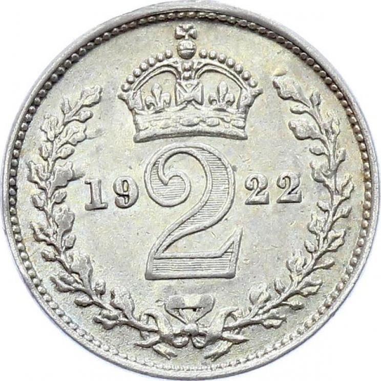 Find out the current coin value of the British Twopence 1922 . This silver coin from the times of George V. Wondering how much a coin like this is worth? The record price belongs to the lot 644 sold at the Katz Auction auction for EUR 23. Bidding took place December 22, 2018.