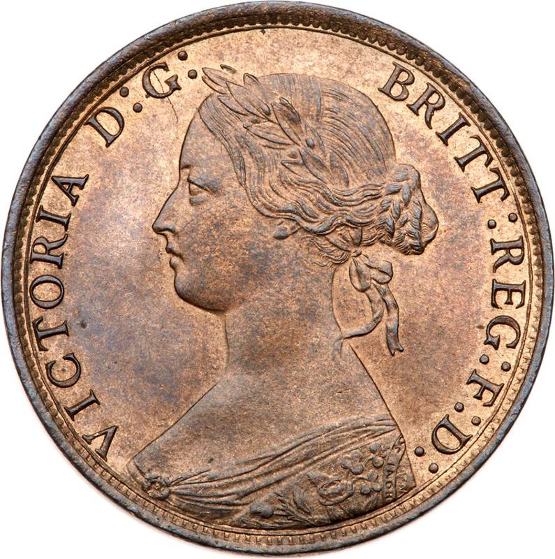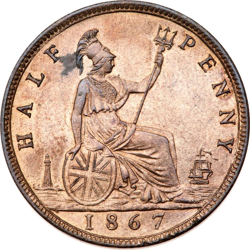 Find out the current coin value of the British Halfpenny 1867 . This bronze coin from the times of Victoria. Wondering how much a coin like this is worth? The record price belongs to the lot 24433 sold at the Heritage Auctions auction for USD 1,955. Bidding took place January 2, 2012.