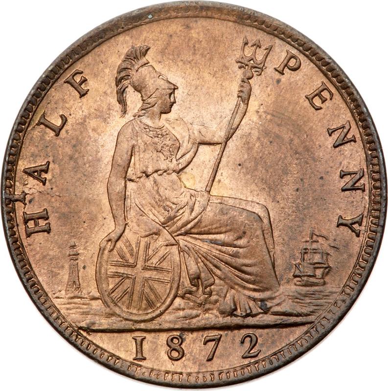 Find out the current coin value of the British Halfpenny 1872 . This bronze coin from the times of Victoria. Wondering how much a coin like this is worth? The record price belongs to the lot 4140 sold at the Ira & Larry Goldberg Coins & Collectibles, Inc. auction for USD 336. Bidding took place June 10, 2018.