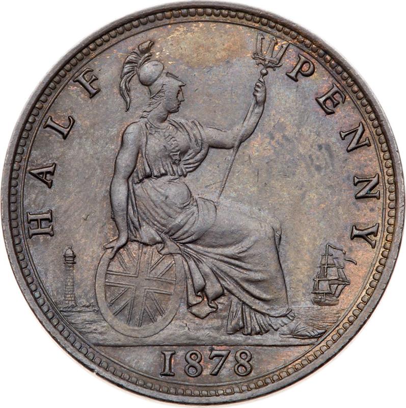 Find out the current coin value of the British Halfpenny 1878 . This bronze coin from the times of Victoria. Wondering how much a coin like this is worth? The record price belongs to the lot 681 sold at the Stack's Bowers auction for USD 402.5. Bidding took place January 10, 2011.