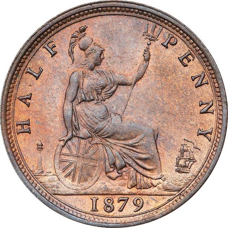 Find out the current coin value of the British Halfpenny 1879 . This bronze coin from the times of Victoria. Wondering how much a coin like this is worth? The record price belongs to the lot 3435 sold at the Auction World auction for JPY 28,000. Bidding took place April 17, 2021.
