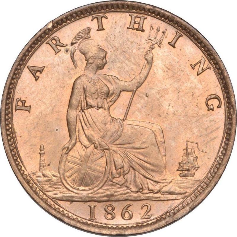 Find out the current coin value of the British Farthing 1862 . This bronze coin from the times of Victoria. Wondering how much a coin like this is worth? The record price belongs to the lot 22676 sold at the Heritage Auctions auction for USD 518. Bidding took place August 12, 2010.