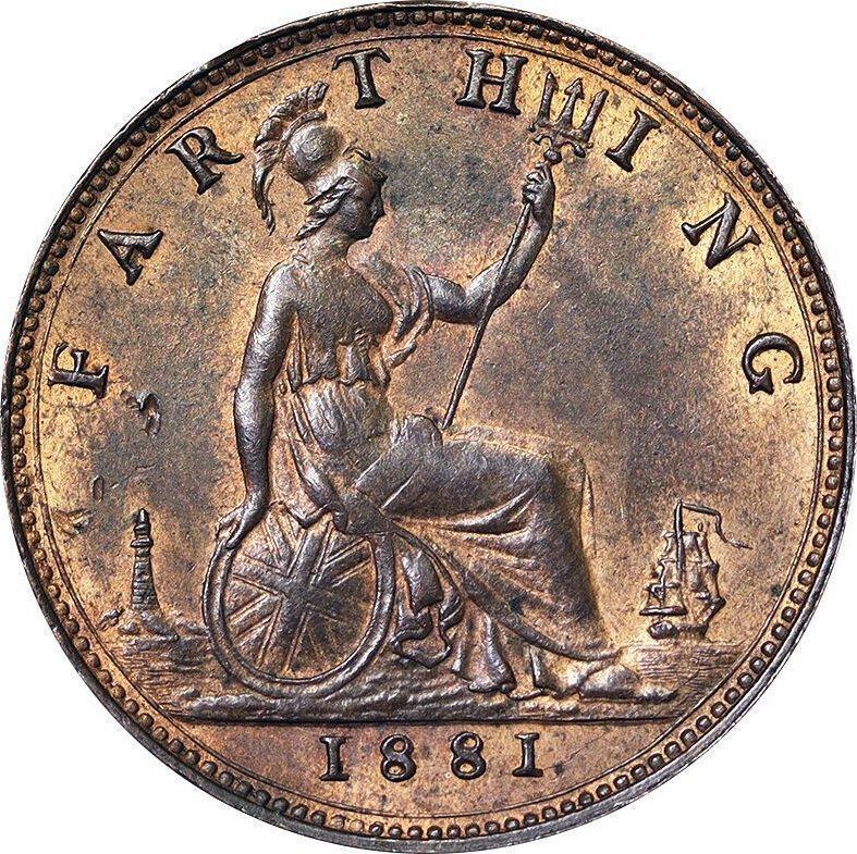 Find out the current coin value of the British Farthing 1881 . This bronze coin from the times of Victoria. Wondering how much a coin like this is worth? The record price belongs to the lot 61450 sold at the Heritage Auctions auction for USD 1,020. Bidding took place February 3, 2021.