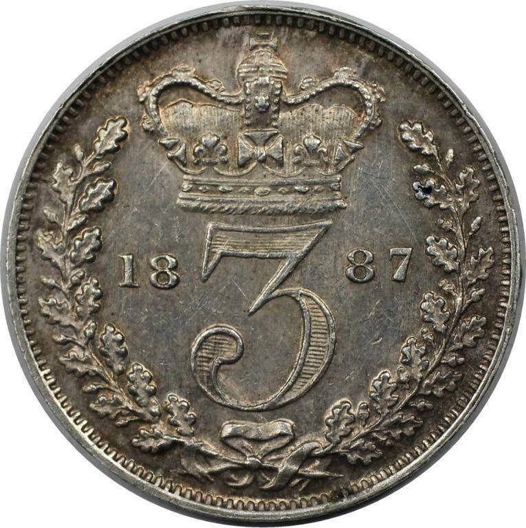 Find out the current coin value of the British Threepence 1887 . This silver coin from the times of Victoria. Wondering how much a coin like this is worth? The record price belongs to the lot 150 sold at the Baldwin's of St. James's auction for GBP 1,500. Bidding took place April 14, 2021.