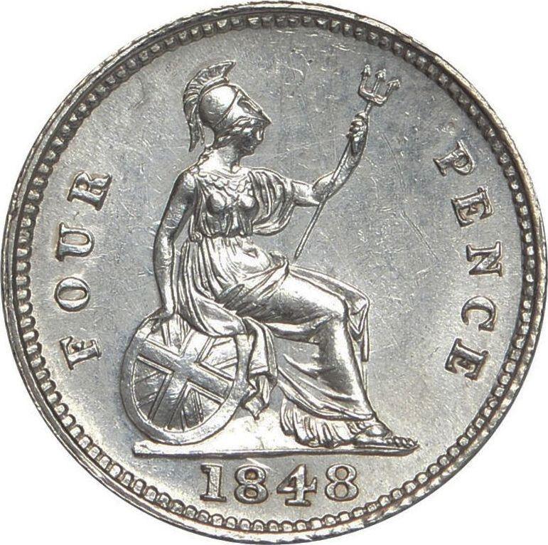 Find out the current coin value of the British Fourpence (Groat) 1848 . This silver coin from the times of Victoria. Wondering how much a coin like this is worth? The record price belongs to the lot 51385 sold at the Heritage Auctions auction for USD 546. Bidding took place September 27, 2007.