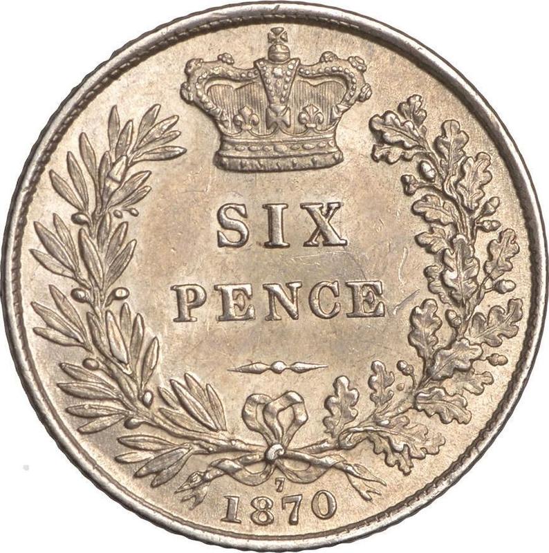Find out the current coin value of the British Sixpence 1870 . This silver coin from the times of Victoria. Wondering how much a coin like this is worth? The record price belongs to the lot 2409 sold at the Ira & Larry Goldberg Coins & Collectibles, Inc. auction for USD 1,380. Bidding took place May 28, 2006.