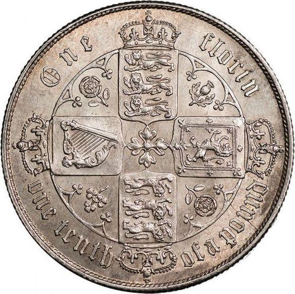 Find out the current coin value of the British Florin 1858 "Gothic" with mark WW. This silver coin from the times of Victoria. Wondering how much a coin like this is worth? The record price belongs to the lot 24440 sold at the Heritage Auctions auction for USD 2,990. Bidding took place January 2, 2012.