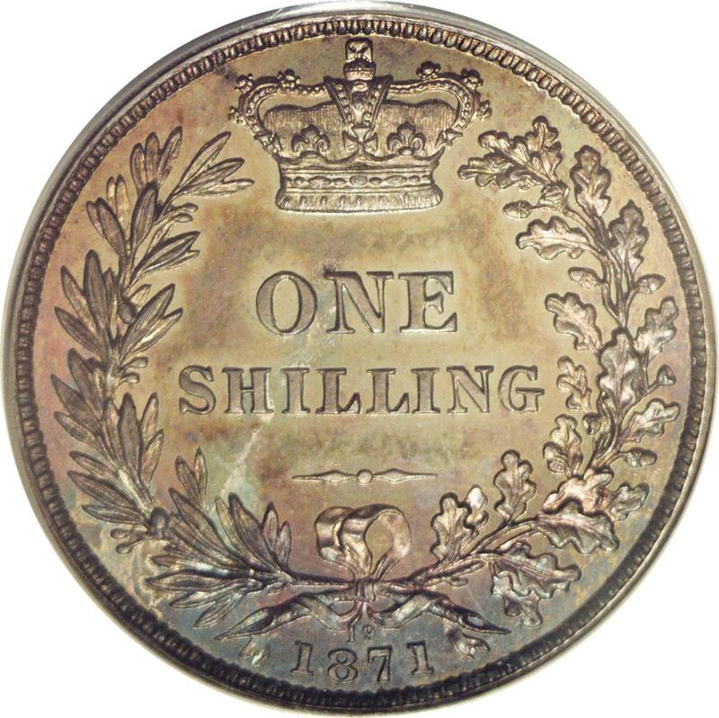 Find out the current coin value of the British Shilling 1871 . Plain edge. This silver coin from the times of Victoria. Wondering how much a coin like this is worth? The record price belongs to the lot 31270 sold at the Heritage Auctions auction for USD 12,925. Bidding took place January 3, 2016.