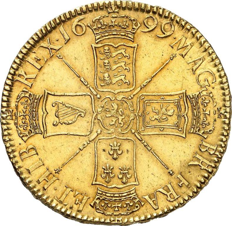 Five guineas 1699 "First laureated bust". Elephant and castle (United Kingdom, William III)