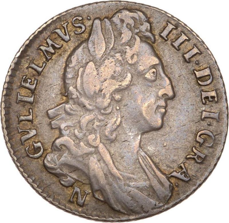 Sixpence 1696 N "First laureated bust". Early harp (United Kingdom, William III)