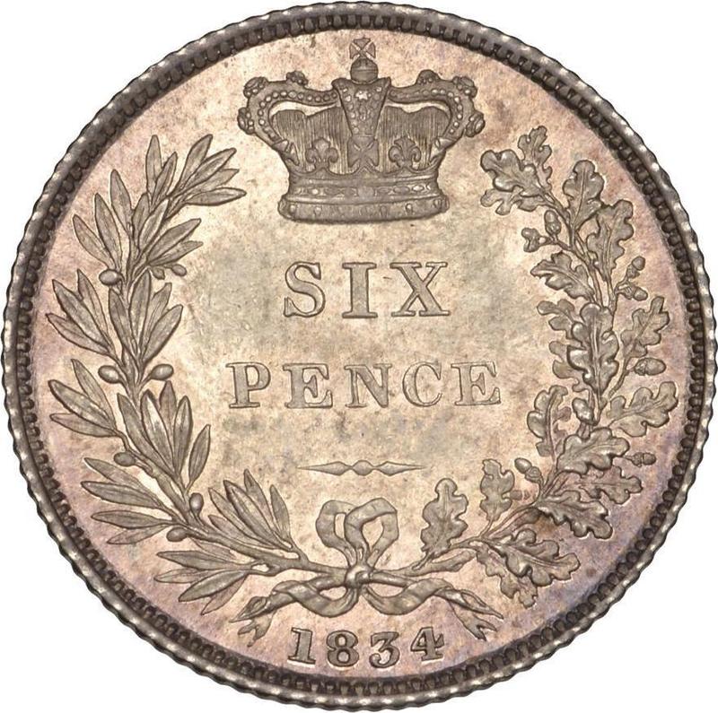 Find out the current coin value of the British Sixpence 1834 . This silver coin from the times of William IV struck at the The Royal mint Mint. Wondering how much a coin like this is worth? The record price belongs to the lot 294 sold at the Baldwin's of St. James's auction for GBP 1,600. Bidding took place September 23, 2013.