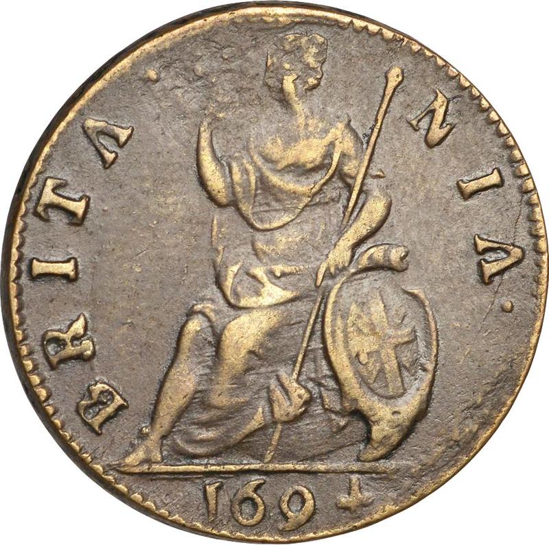 Find out the current coin value of the British Farthing 1694 . This copper coin from the times of William III and Mary II. Wondering how much a coin like this is worth? The record price belongs to the lot 63 sold at the Baldwin's of St. James's auction for USD 3,500. Bidding took place January 13, 2019.