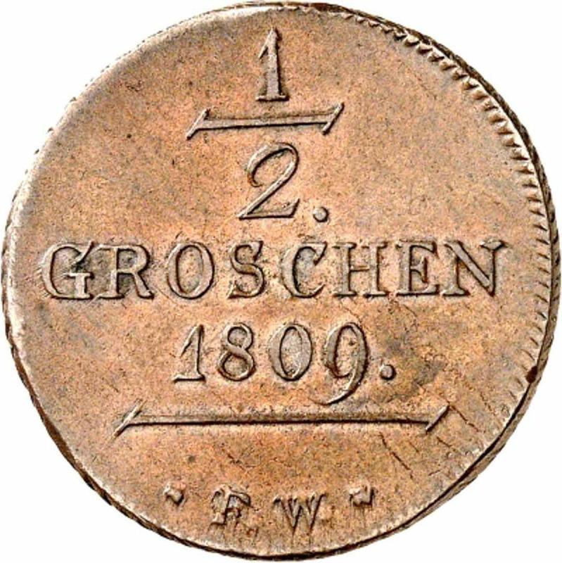 According to the latest data as of December 5, 2025 the average price of a coin 1/2 Groschen 1809 with mark F.W. is 150 USD. The coin is made of non-precious metal, so in poor condition it may have extremely low value and liquidity.