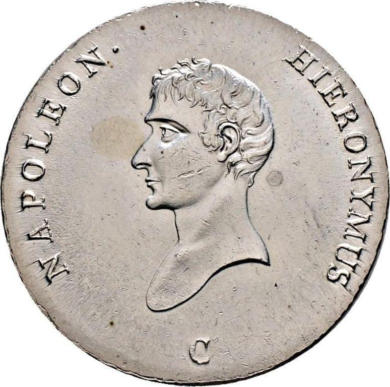 Find out the current coin value of the Westphalian 2/3 Thaler 1808 "Small head" with mark C. This silver coin from the times of Jerome Napoleon. Wondering how much a coin like this is worth? The record price belongs to the lot 1127 sold at the WAG online Auktionen oHG auction for EUR 360. Bidding took place January 14, 2018.