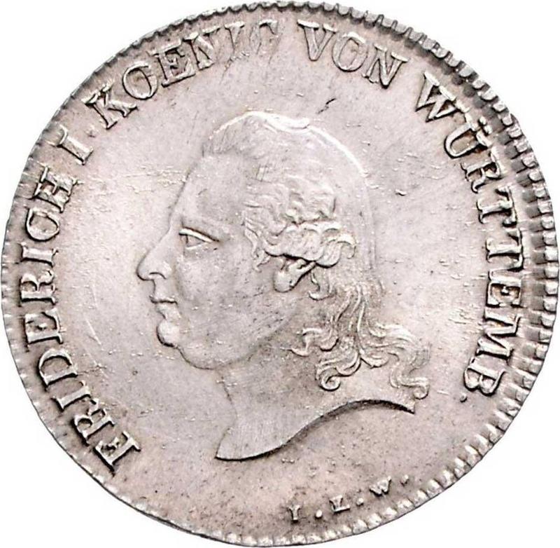 Find out the current coin value of the Württemberg 20 Kreuzer 1810 with mark I.L.W.. This silver coin from the times of Frederick I struck at the Stuttgart Mint. Wondering how much a coin like this is worth? The record price belongs to the lot 383 sold at the Münzenhandlung Harald Möller GmbH auction for EUR 600. Bidding took place November 15, 2021.