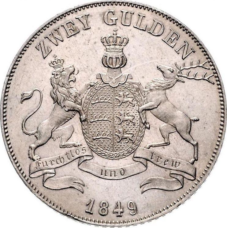 Find out the current coin value of the Württemberg 2 Gulden 1849 . This silver coin from the times of William I struck at the Stuttgart Mint. Wondering how much a coin like this is worth? The record price belongs to the lot 31226 sold at the Heritage Auctions auction for USD 2,280. Bidding took place January 9, 2023.