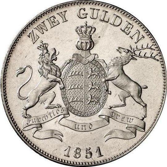 Find out the current coin value of the Württemberg 2 Gulden 1851 . This silver coin from the times of William I struck at the Stuttgart Mint. Wondering how much a coin like this is worth? The record price belongs to the lot 63412 sold at the Heritage Auctions auction for USD 1,080. Bidding took place April 14, 2021.