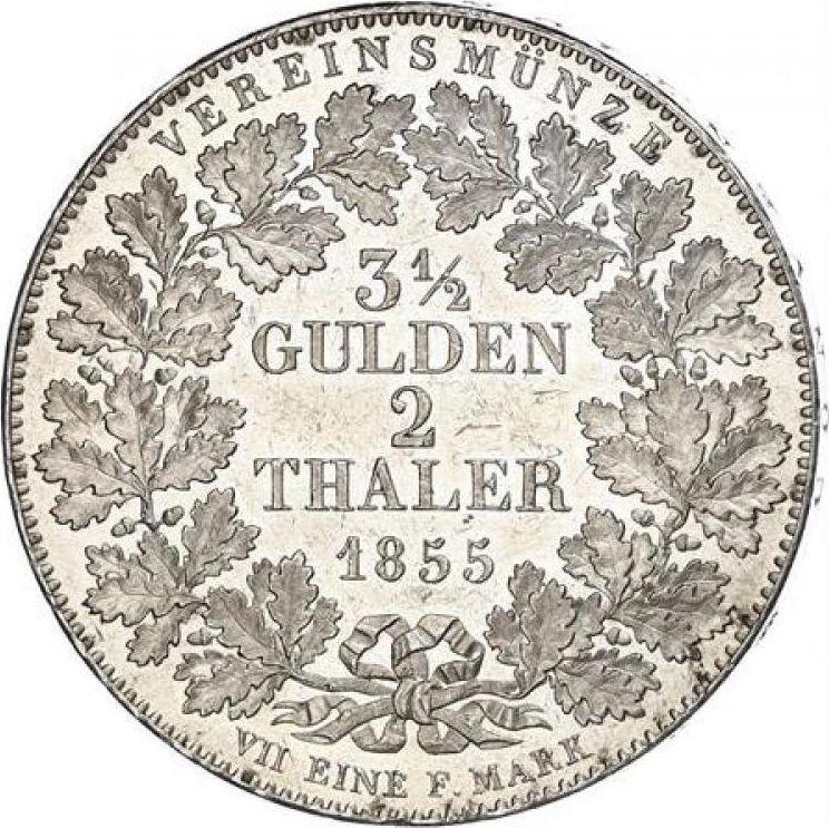 Find out the current coin value of the Württemberg 2 Thaler 1855 . This silver coin from the times of William I struck at the Stuttgart Mint. Wondering how much a coin like this is worth? The record price belongs to the lot 1561 sold at the Emporium Hamburg Münzhandelsgesellschaft mbH auction for EUR 2,400. Bidding took place November 17, 2025.