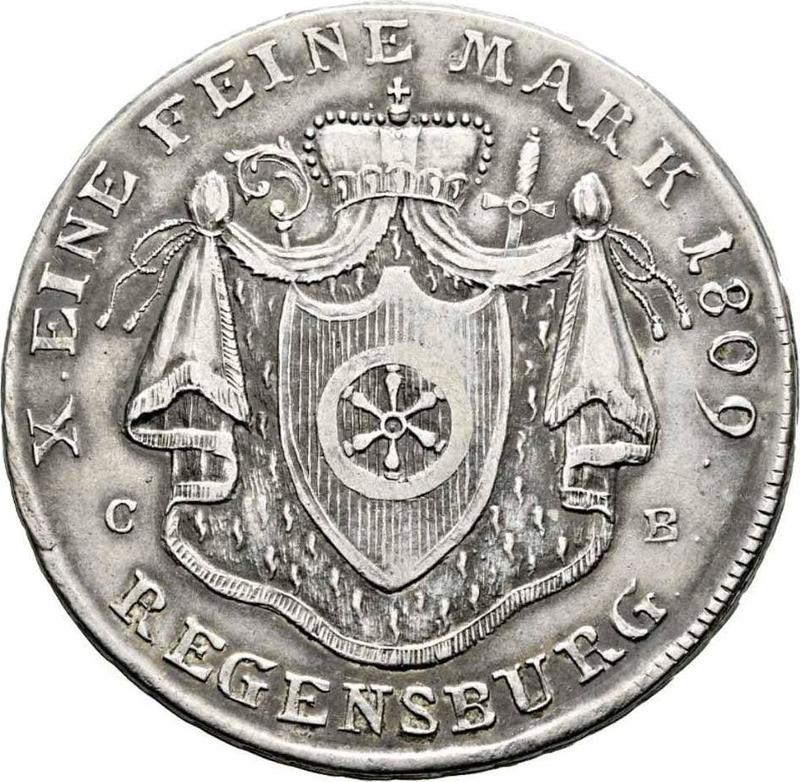 Entdecken Sie den aktuellen Wert der regensburgischen Münze Taler 1809 mit Markierung CB. Diese Silbermünze stammt aus der Zeit von Carl Theodor von Dalberg und wurde vom Münzamt in Regensburg geprägt. Wie viel ist eine solche Münze wert? Der Rekordpreis gehört zu Los 4944, welches bei Fritz Rudolf Künker GmbH & Co. KG für 2.200 EUR verkauft wurde. Die Versteigerung erfolgte am 9. Oktober 2013.