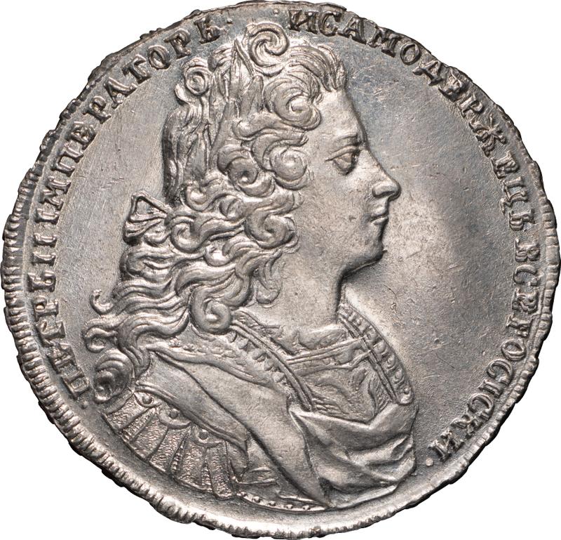 Rubel 1729 "Moskauer Typ". Kopf trennt die Inschrift (Rußland, Peter II)