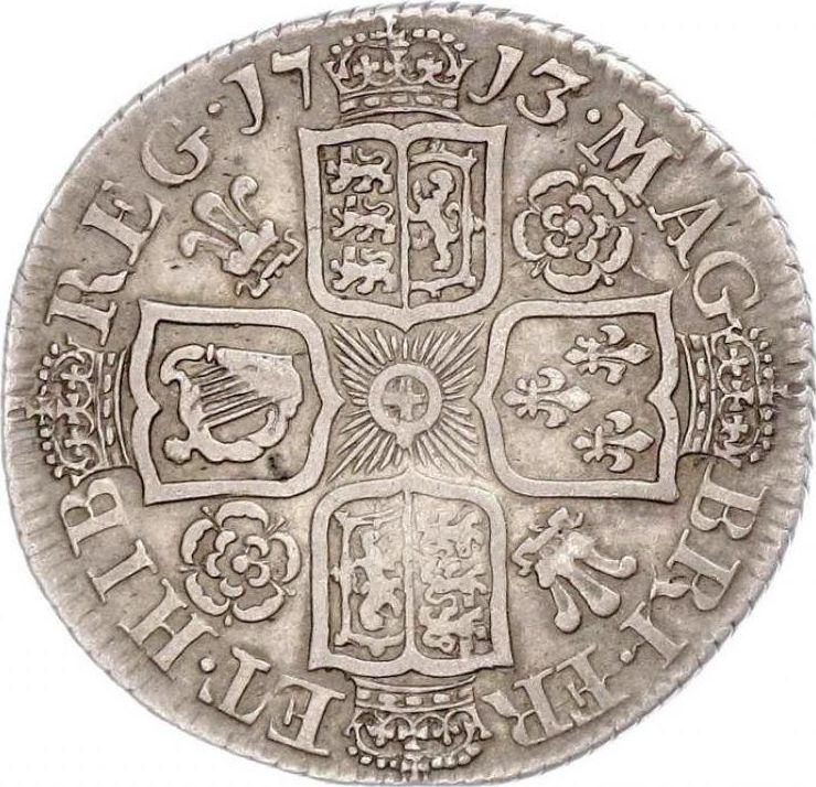 1 Schilling 1713 "Vierter Porträttyp". Rosen und Federn in Winkeln (Großbritannien, Anne)