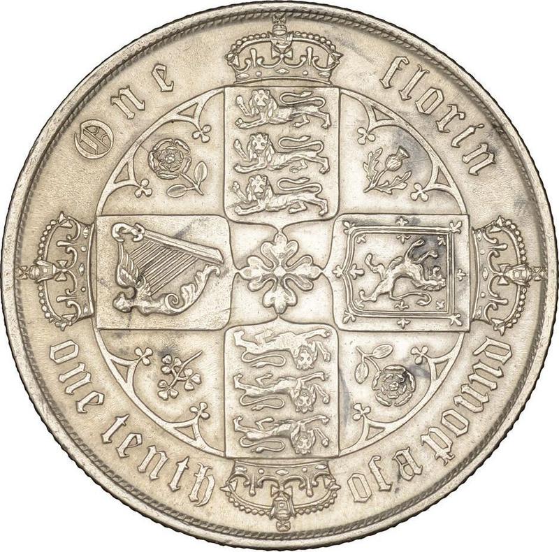 Entdecken Sie den aktuellen Wert der britischen Münze 2 Schilling (Florin) 1873 "Gotisch" mit Markierung WW. Diese Silbermünze stammt aus der Zeit von Victoria und wurde vom Münzamt in London geprägt. Wie viel ist eine solche Münze wert? Der Rekordpreis gehört zu Los 35390, welches bei Heritage Auctions für 5.040 USD verkauft wurde. Die Versteigerung erfolgte am 27. August 2025.