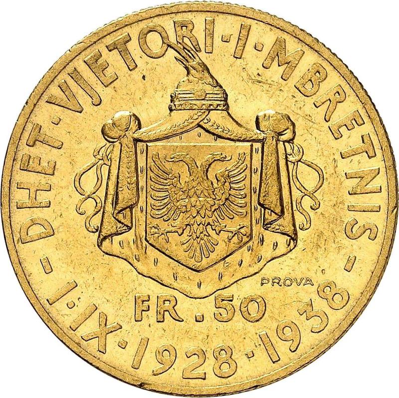 Pruebas 50 franga ari 1938 R. Inscripción PROVA (Albania, Zog I)