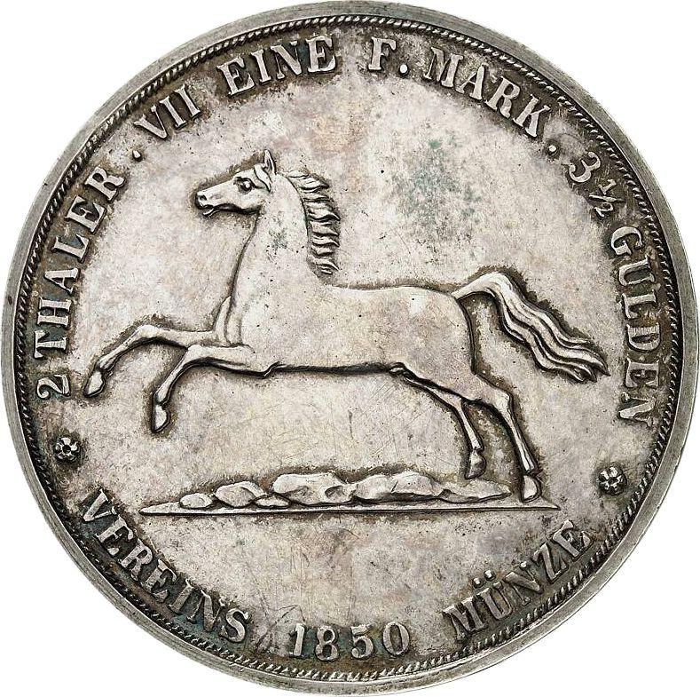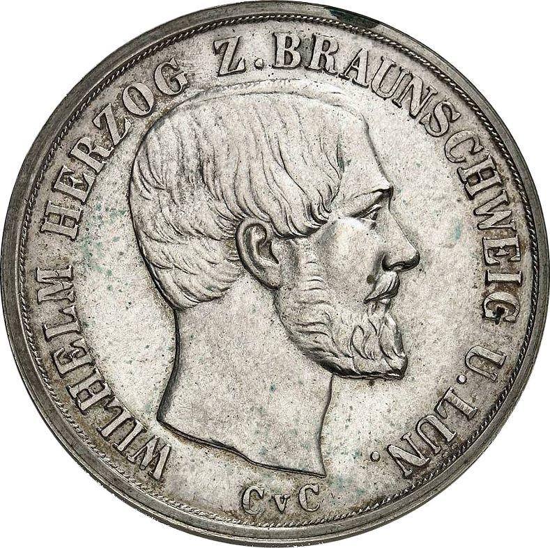 Descubra el valor actual de la moneda Brunswick-Wolfenbüttel de 2 táleros de 1850Pruebas con marca de ceca CvC. Esta moneda de plata pertenece al tiempo de Guillermo y fue acuñada en la ceca de Brunswick. ¿Cuál es el precio de una moneda como esta? El precio récord pertenece al lote 3168 vendido en la subasta Auction World por JPY 1700000. La subasta tuvo lugar el 15 de abril de 2023.