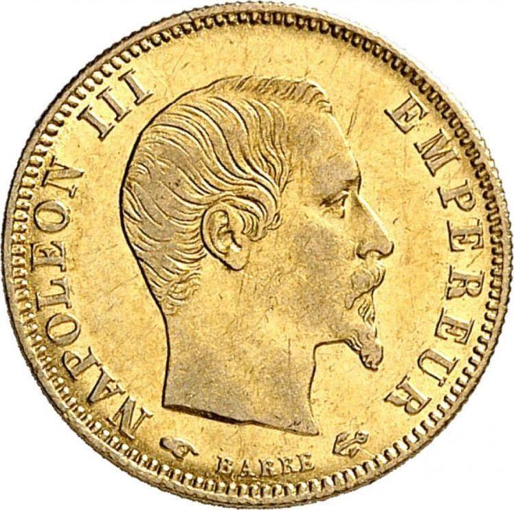 Descubra el valor actual de la moneda francesa de 5 francos de 1855 con marca de ceca A. Esta moneda de oro pertenece al tiempo de Napoleón III Bonaparte y fue acuñada en la ceca de París. ¿Cuál es el precio de una moneda como esta? El precio récord pertenece al lote 3262 vendido en la subasta Auction World por JPY 750000. La subasta tuvo lugar el 21 de julio de 2019.