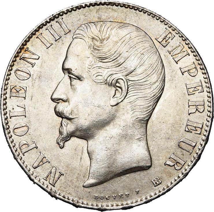 Descubra el valor actual de la moneda francesa de 5 francos de 1855 con marca de ceca BB. Esta moneda de plata pertenece al tiempo de Napoleón III Bonaparte y fue acuñada en la ceca de Estrasburgo. ¿Cuál es el precio de una moneda como esta? El precio récord pertenece al lote 143 vendido en la subasta Chaponnière & Firmenich SA por CHF 3500. La subasta tuvo lugar el 5 de julio de 2017.