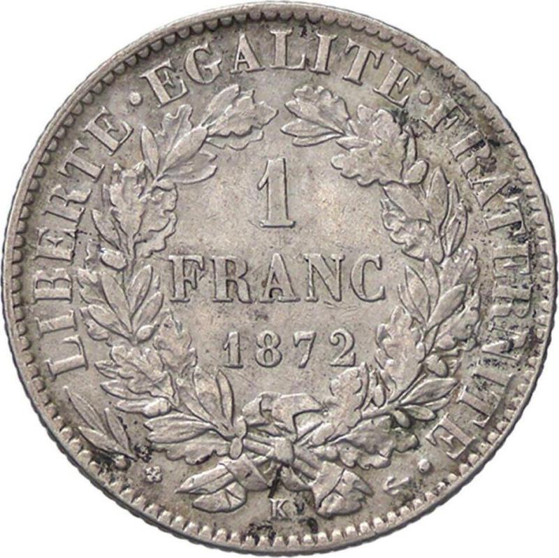 Descubra el valor actual de la moneda francesa de 1 franco de 1872 con marca de ceca K. Esta moneda de plata pertenece al tiempo de la Tercera República y fue acuñada en la ceca de Burdeos. ¿Cuál es el precio de una moneda como esta? El precio récord pertenece al lote 124 vendido en la subasta cgb.fr por EUR 981. La subasta tuvo lugar el 24 de abril de 2013.
