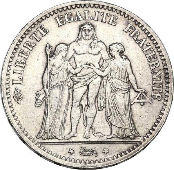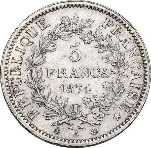 Descubra el valor actual de la moneda francesa de 5 francos de 1874 "Hércules" con marca de ceca A. Esta moneda de plata pertenece al tiempo de la Tercera República y fue acuñada en la ceca de París. ¿Cuál es el precio de una moneda como esta? El precio récord pertenece al lote 3955 vendido en la subasta Heritage Auctions por USD 216000. La subasta tuvo lugar el 4 de mayo de 2022.
