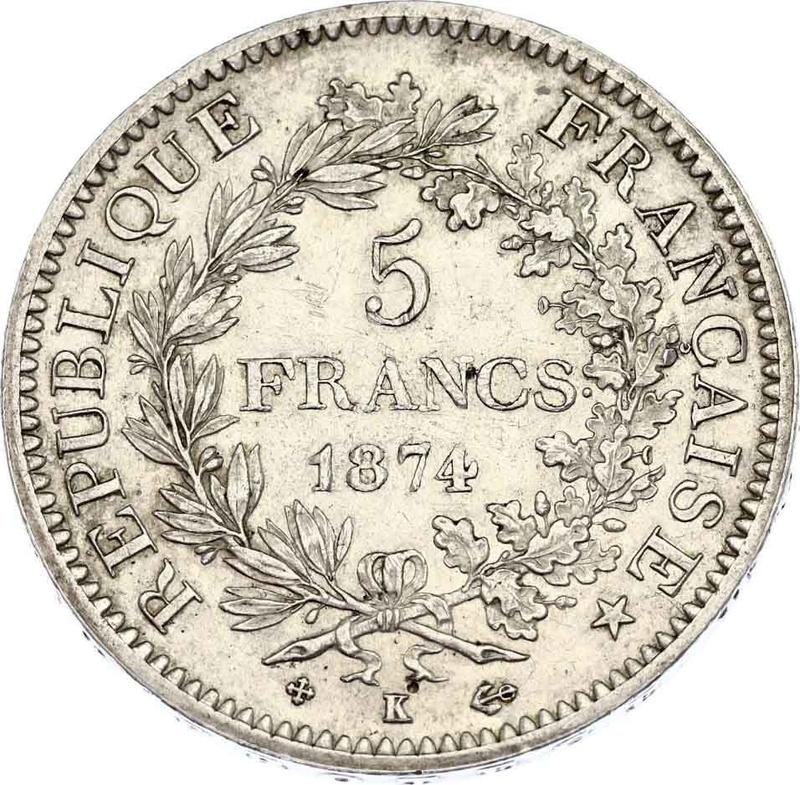 5 francos 1874 K "Hércules" (Francia, Tercera República)