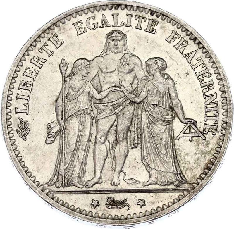 Descubra el valor actual de la moneda francesa de 5 francos de 1874 "Hércules" con marca de ceca K. Esta moneda de plata pertenece al tiempo de la Tercera República y fue acuñada en la ceca de Burdeos. ¿Cuál es el precio de una moneda como esta? El precio récord pertenece al lote 20500 vendido en la subasta Stack's Bowers por USD 1000. La subasta tuvo lugar el 14 de agosto de 2018.