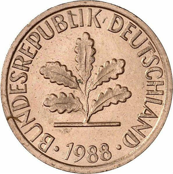 Según los últimos datos, a fecha de 20 de diciembre de 2025, el valor medio de la moneda de 1 Pfennig del 1988. F es de 100 USD. La moneda no está hecha de un metal precioso, por lo que si su estado de conservación es deficiente, su valor y liquidez pueden ser muy bajos.