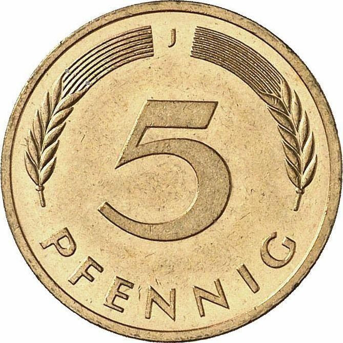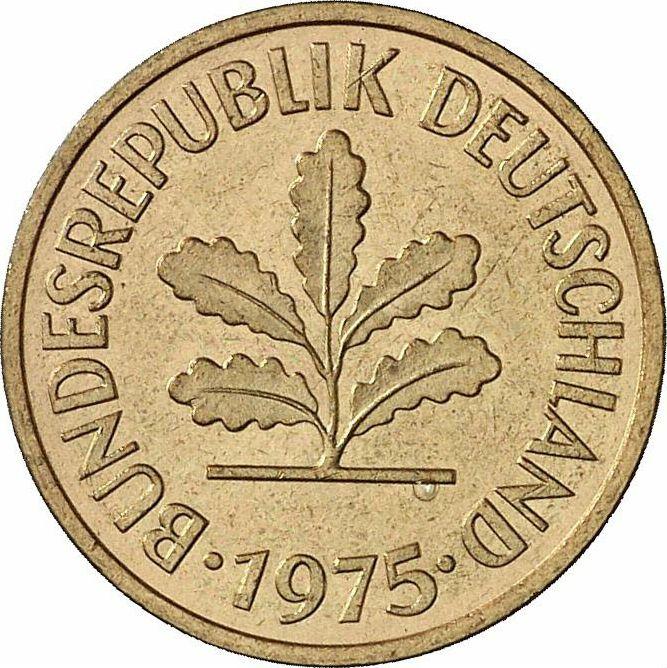 Descubra el valor actual de la moneda alemana de 5 Pfennige de 1975 con marca de ceca J. Esta moneda de hierro pertenece al tiempo de la RFA y fue acuñada en la ceca de Hamburgo