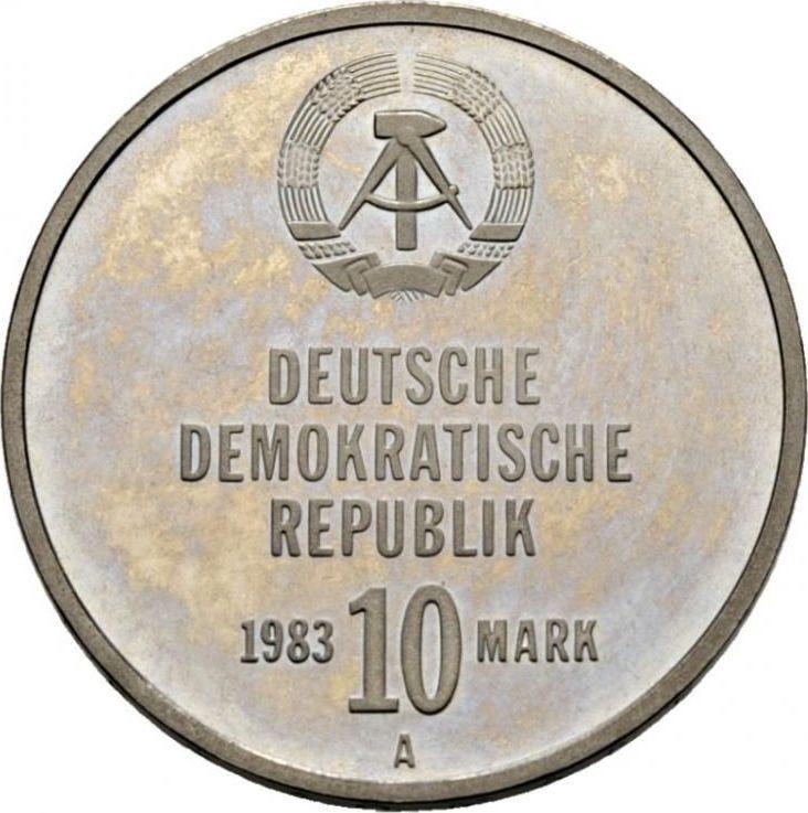 Descubra el valor actual de la moneda alemana de 10 marcos de 1983 "Grupos de combate de la clase obrera" con marca de ceca A. Esta moneda de alpaca pertenece al tiempo de la República Democrática Alemana (RDA) y fue acuñada en la ceca de Berlín. ¿Cuál es el precio de una moneda como esta? El precio récord pertenece al lote 1653 vendido en la subasta Katz Auction por EUR 80. La subasta tuvo lugar el 29 de mayo de 2016.