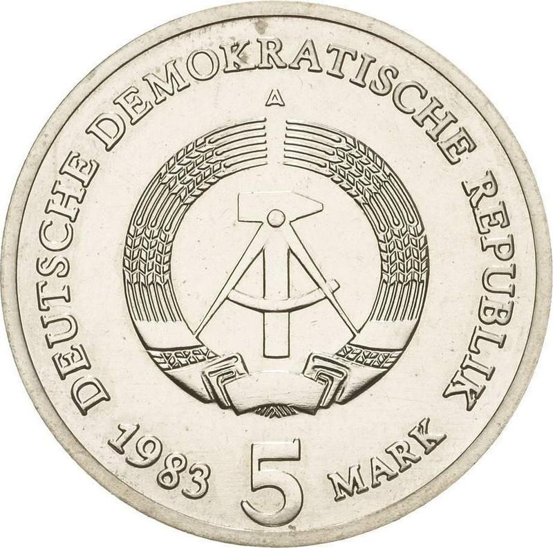 Descubra el valor actual de la moneda alemana de 5 marcos de 1983 "La Puerta de Brandeburgo" con marca de ceca A. Esta moneda de cuproníquel pertenece al tiempo de la República Democrática Alemana (RDA) y fue acuñada en la ceca de Berlín. ¿Cuál es el precio de una moneda como esta? El precio récord pertenece al lote 4368 vendido en la subasta Fritz Rudolf Künker GmbH & Co. KG por EUR 3600. La subasta tuvo lugar el 24 de junio de 2015.