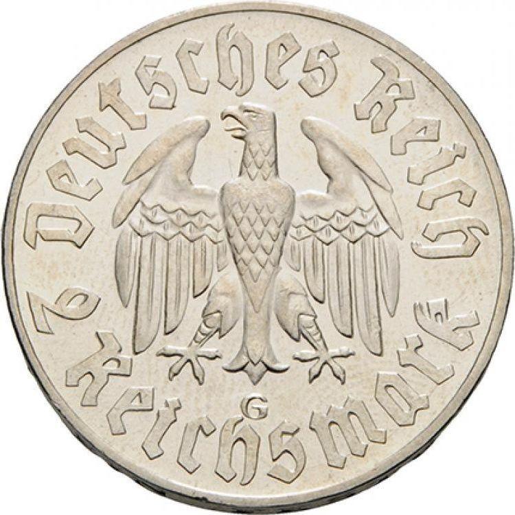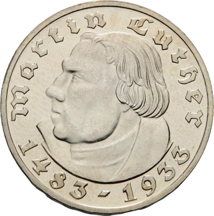 Descubra el valor actual de la moneda alemana de 2 Reichsmarks de 1933 "Martín Lutero" con marca de ceca G. Esta moneda de plata pertenece al tiempo de la Alemania nazi y fue acuñada en la ceca de Karlsruhe. ¿Cuál es el precio de una moneda como esta? El precio récord pertenece al lote 1054 vendido en la subasta SINCONA AG por CHF 8750. La subasta tuvo lugar el 23 de mayo de 2012.