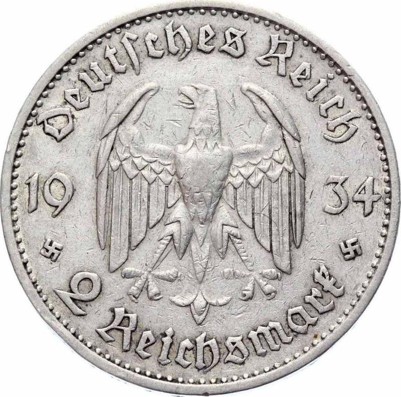 ¿Cuánto vale la moneda de platade de la Alemania nazi de 2 Reichsmarks del 1934. G. "Iglesia de guarnición (con fecha)"?