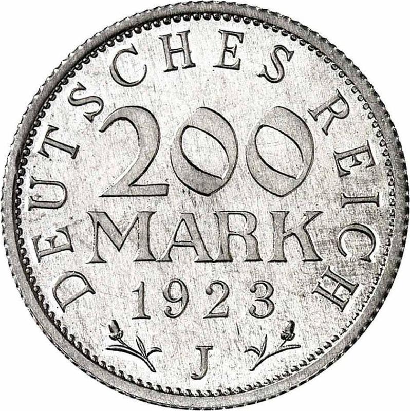 Según los últimos datos, a fecha de 5 de diciembre de 2025, el valor medio de la moneda de 200 marcos del 1923. J es de 3 USD para las monedas de acuñación regular y de 430 USD para las monedas PROOF. La moneda no está hecha de un metal precioso, por lo que si su estado de conservación es deficiente, su valor y liquidez pueden ser muy bajos.