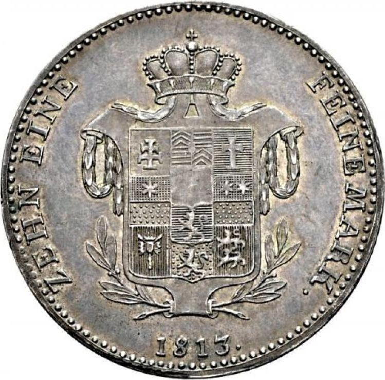 Descubra el valor actual de la moneda Hesse-Cassel de Tálero de 1813Prueba con marca de ceca K. Canto liso. Reacuñación. Esta moneda de plata pertenece al tiempo de Guillermo I y fue acuñada en la ceca de Kassel. ¿Cuál es el precio de una moneda como esta? El precio récord pertenece al lote 177 vendido en la subasta Fritz Rudolf Künker GmbH & Co. KG por EUR 4000. La subasta tuvo lugar el 27 de enero de 2011.