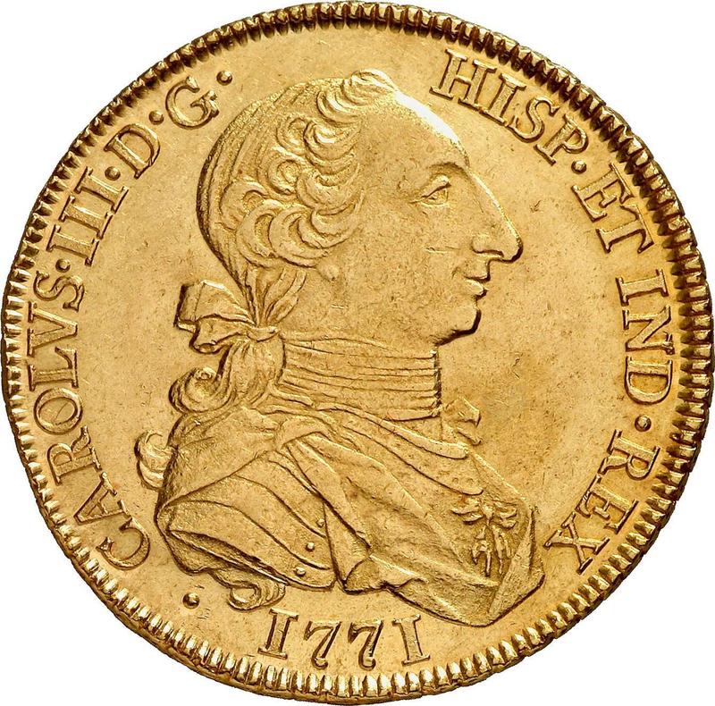 Descubra el valor actual de la moneda mexicana de 8 escudos de 1771 con marca de ceca Mo MF. Esta moneda de oro pertenece al tiempo de Carlos III y fue acuñada en la ceca de Ciudad de México. ¿Cuál es el precio de una moneda como esta? El precio récord pertenece al lote 31243 vendido en la subasta Heritage Auctions por USD 17625. La subasta tuvo lugar el 13 de agosto de 2015.